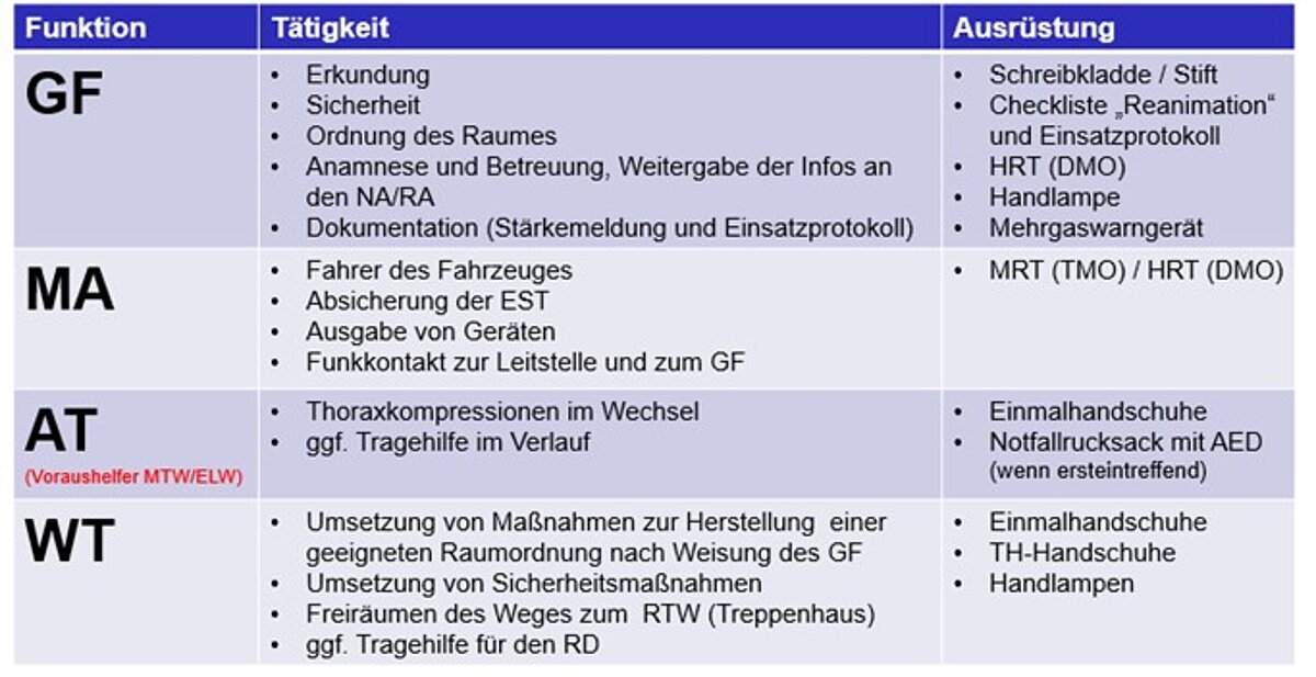 Die Einsatzleitung verbleibt beim Rettungsdienst. Die Feuerwehr agiert unterstützend und folgt den Weisungen des medizinischen Einsatzleiters. Die Aufgabenverteilung erfolgt nach einer standardisierten Einsatzregelung. Der Angriffstrupp übernimmt die Reanimationsmaßnahmen (alle 2 Minuten Helferwechsel), der Wassertrupp sorgt für Sicherheit, Raumordnung und bereitet den Transportweg vor. Der Gruppenführer koordiniert die Maßnahmen, unterstützt die medizinische Anamnese mittels einer Checkliste und dokumentiert den Einsatz.