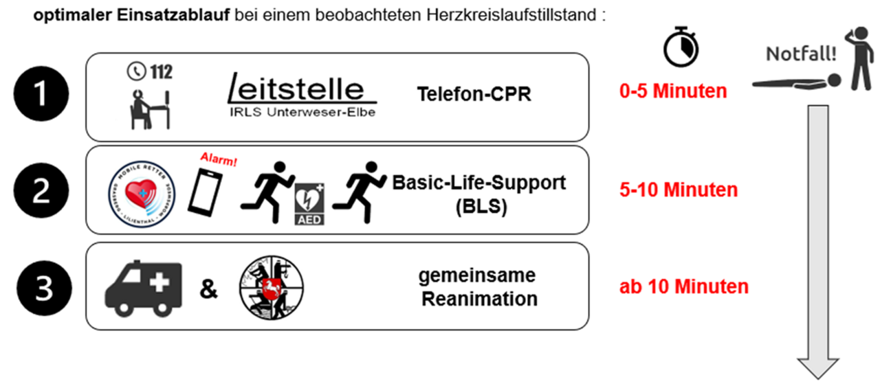 Das Projekt ist als integrativer Bestandteil der Rettungskette konzipiert. Diese beginnt mit der telefonischen Anleitung zur Reanimation durch die Leitstelle Bremerhaven, setzt sich fort mit der Alarmierung von Mobilen Rettern über die Ersthelfer-App und wird durch die Feuerwehr ergänzt. Alle Feuerwehrangehörigen der AED-Gruppen sind zugleich als Mobile Retter registriert oder befinden sich in der Vorbereitung zur Teilnahme.