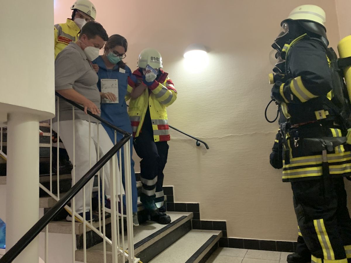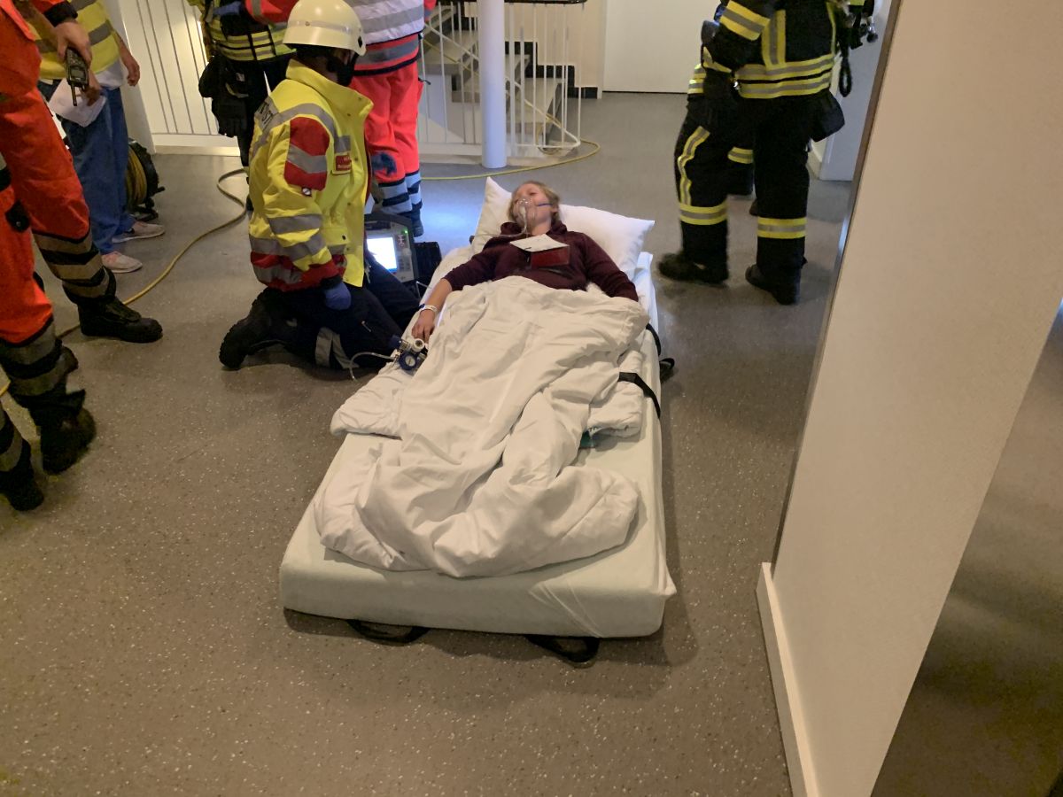 Durch die Polizei wurden sofort umfangreiche Absperrmaßnahmen eingeleitet. Es galt in der Folge 9 Patienten von der Station 4 zu retten. Diese wurden durch Atemschutzgeräteträger zunächst aus dem verrauchten Stationsabschnitt über die Rettungsmatratzen horizontal in rauchfreie Bereiche gezogen. Anschließend mussten diese durch Kräfte des Krankenhauspersonals und der Feuerwehr vertikal durch den Treppenraum transportiert werden. Die Person aus dem Brandraum musste durch die Einsatzkräfte reanimiert werden. Zudem entwickelten im weiteren Übungsverlauf zwei Mitarbeiterinnen der Station 4 Symptome einer Rauchgasvergiftung und mussten ebenfalls notfallmedizinisch versorgt werden. Die große Herausforderung war hierbei, dass die Patienten nach der Rettung von der Station an einer Sichtungsstelle im Erdgeschoß alle durch den Notarzt gesichtet und Behandlungs- und Transportprioritäten festgelegt werden mussten. Zudem mussten Krankenhausärzte mit den Notärzten des Rettungsdienstes zusammenarbeiten und die Vollzähligkeit überprüfen. Hierbei fiel dann auch auf, dass zwei Patienten fehlen, so dass der Einsatzleiter zusätzlich noch eine Personensuche einleiten musste.