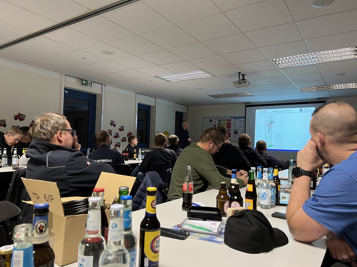 Übungsleiter Lars van den Hoogen skizzierte anhand von Bildern, Videos und einer Zeittabelle noch einmal den Ablauf der gesamten Übung. Im Rahmen dessen schilderte er, was nach Meinung der Beobachter alles gut lief. Aber er beleuchtete auch die Punkte, die nicht gut oder gar nicht funktioniert hatten und nannte die Ursachen. Es gab organisatorische und strukturelle Mängel, aber auch persönliche Fehler. Diese wurden sachlich angesprochen, da es einzig dem Zweck diente, daraus zu lernen und diese Dinge beim nächsten Mal, was dann möglicherweise ein Ernstfall ist, besser zu machen.