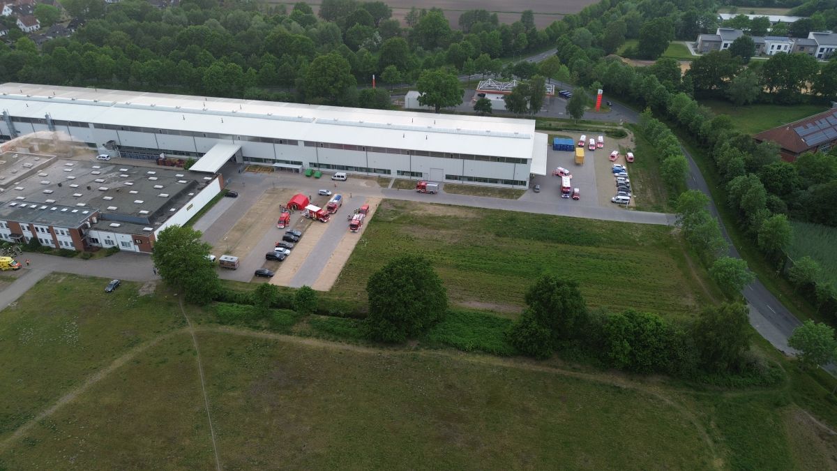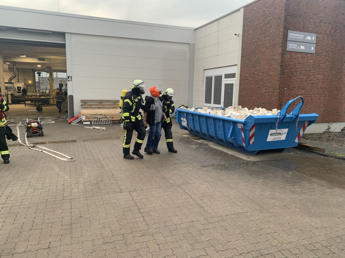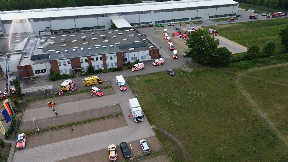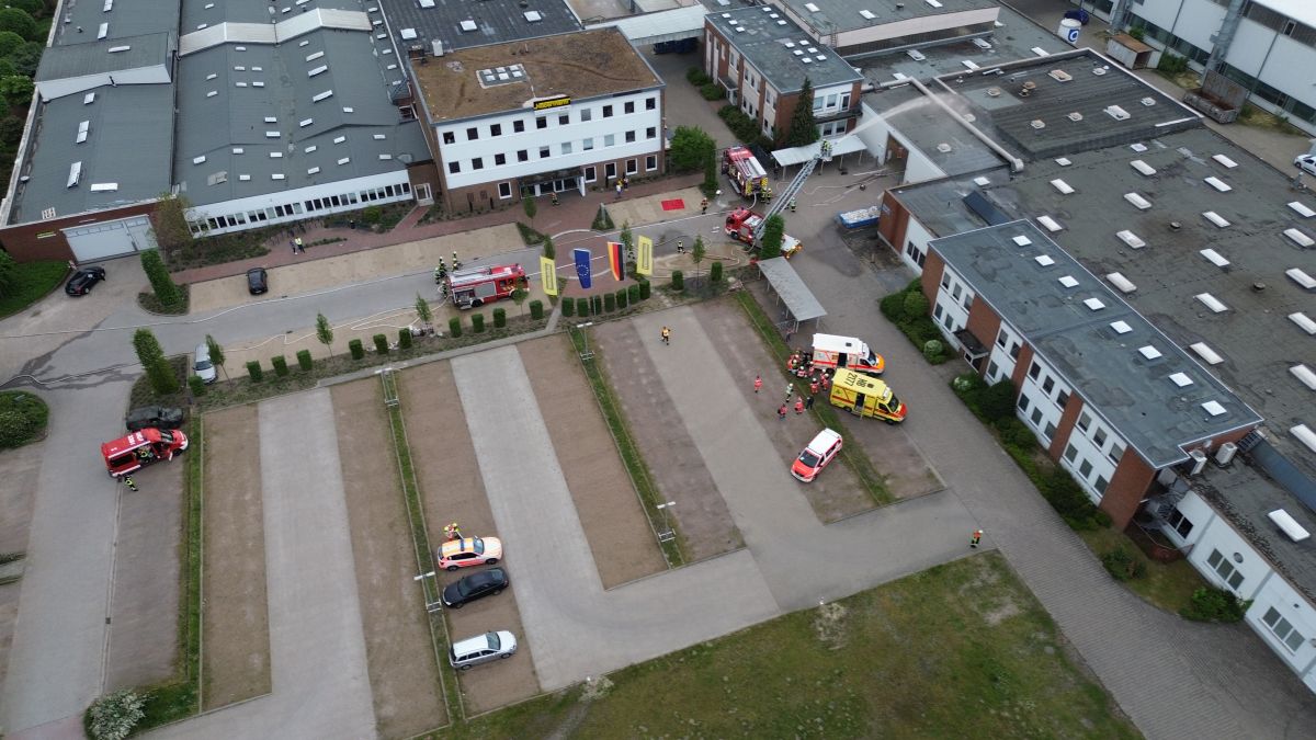 Der Rettungsdienst bildete eine Patientenablage und führte eine Sichtung und Erstversorgung der Patienten durch und setze entsprechende Behandlungsprioritäten im Sinne der Einsatztaktik für einen Massenanfall für Verletzte (MANV). Zudem mussten noch Betriebsangehörige außerhalb der Halle gesichtet werden. Nach ca. 30 Minuten und Abschluss der Menschenrettung in der Halle sah dann das Drehbuch vor, dass es zu einer plötzlichen Brandausbreitung im Dachbereich kam, so dass die akute Gefahr der Ausbreitung des Feuers auf den Betrieb 2 bestand. Nun galt es die Einsatzmaßnahmen von der Menschenrettung auf die Brandbekämpfung zu verlagern. Es wurde eine sogenannte Riegelstellung zum Betrieb 2 mit zwei Drehleitern (Lilienthal und Worpswede) eingerichtet. Hierzu bildete der übende Einsatzleiter zwei Brandbekämpfungsabschnitte „Nord“ und „Süd“. Im Abschnitt „Süd“ galt es weiterhin das Verwaltungsgebäude des Betriebs 3 vor einer Brandausbreitung zu schützen. Für die Riegelstellungen mussten jeweils umfassende Löschwasserversorgungen durch die übenden Einsatzkräfte aufgebaut werden. In einem separaten Einsatzabschnitt „Logistik“ wurde eine Atemschutzsammelstelle und ein Entkleideplatz für Maßnahmen der Einsatzstellenhygiene eingerichtet. Währenddessen wurde im Einsatzabschnitt Rettungsdienst die weitere Versorgung der Patienten und die Klärung der Transportprioritäten durch den Organisatorischen Leiter Rettungsdienst (OrgL) und der Leitenden Notärztin (LNA) koordiniert. Hierzu wurde eigens auf dem Gelände der Firma Nabertherm eine Übungsklinik „Links der Wümme“ eingerichtet. Hier wurde nach dem Transport der Patienten die Übergabe vom öffentlichen Rettungsdienst an das Krankenhauspersonal simuliert.