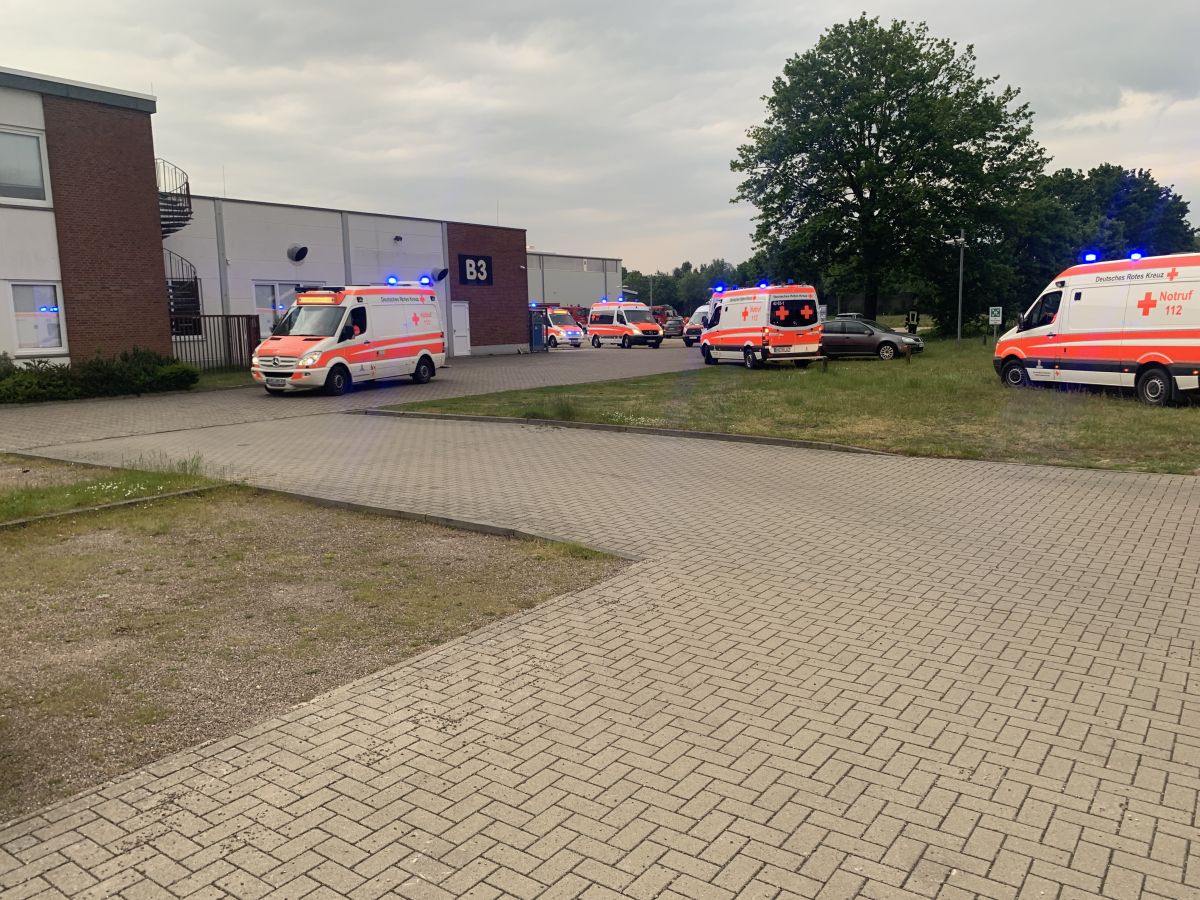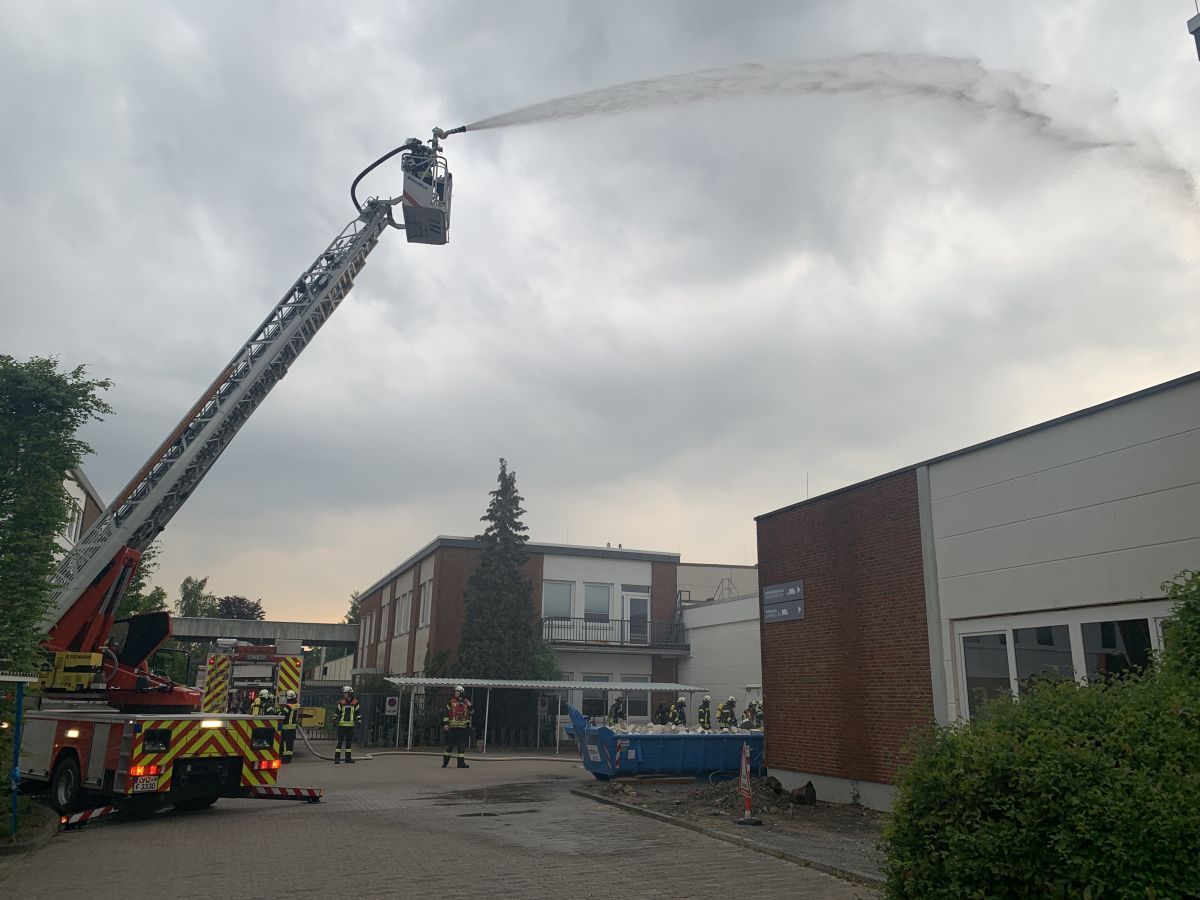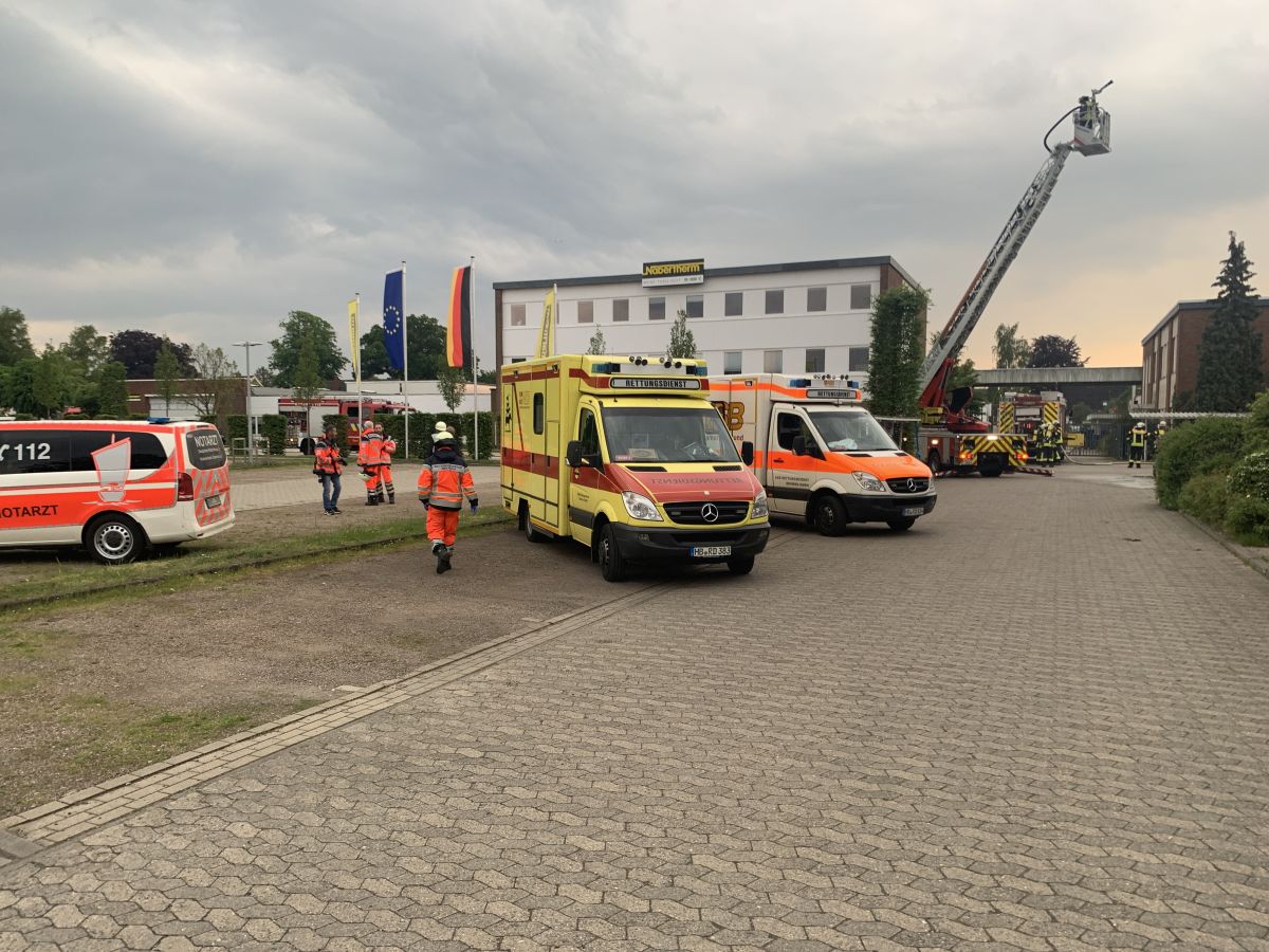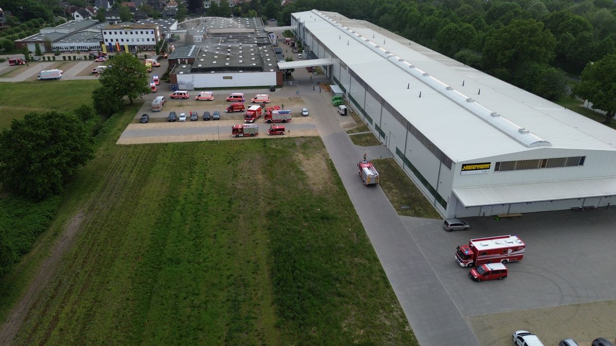 Der Rettungsdienst bildete eine Patientenablage und führte eine Sichtung und Erstversorgung der Patienten durch und setze entsprechende Behandlungsprioritäten im Sinne der Einsatztaktik für einen Massenanfall für Verletzte (MANV). Zudem mussten noch Betriebsangehörige außerhalb der Halle gesichtet werden. Nach ca. 30 Minuten und Abschluss der Menschenrettung in der Halle sah dann das Drehbuch vor, dass es zu einer plötzlichen Brandausbreitung im Dachbereich kam, so dass die akute Gefahr der Ausbreitung des Feuers auf den Betrieb 2 bestand. Nun galt es die Einsatzmaßnahmen von der Menschenrettung auf die Brandbekämpfung zu verlagern. Es wurde eine sogenannte Riegelstellung zum Betrieb 2 mit zwei Drehleitern (Lilienthal und Worpswede) eingerichtet. Hierzu bildete der übende Einsatzleiter zwei Brandbekämpfungsabschnitte „Nord“ und „Süd“. Im Abschnitt „Süd“ galt es weiterhin das Verwaltungsgebäude des Betriebs 3 vor einer Brandausbreitung zu schützen. Für die Riegelstellungen mussten jeweils umfassende Löschwasserversorgungen durch die übenden Einsatzkräfte aufgebaut werden. In einem separaten Einsatzabschnitt „Logistik“ wurde eine Atemschutzsammelstelle und ein Entkleideplatz für Maßnahmen der Einsatzstellenhygiene eingerichtet. Währenddessen wurde im Einsatzabschnitt Rettungsdienst die weitere Versorgung der Patienten und die Klärung der Transportprioritäten durch den Organisatorischen Leiter Rettungsdienst (OrgL) und der Leitenden Notärztin (LNA) koordiniert. Hierzu wurde eigens auf dem Gelände der Firma Nabertherm eine Übungsklinik „Links der Wümme“ eingerichtet. Hier wurde nach dem Transport der Patienten die Übergabe vom öffentlichen Rettungsdienst an das Krankenhauspersonal simuliert.
