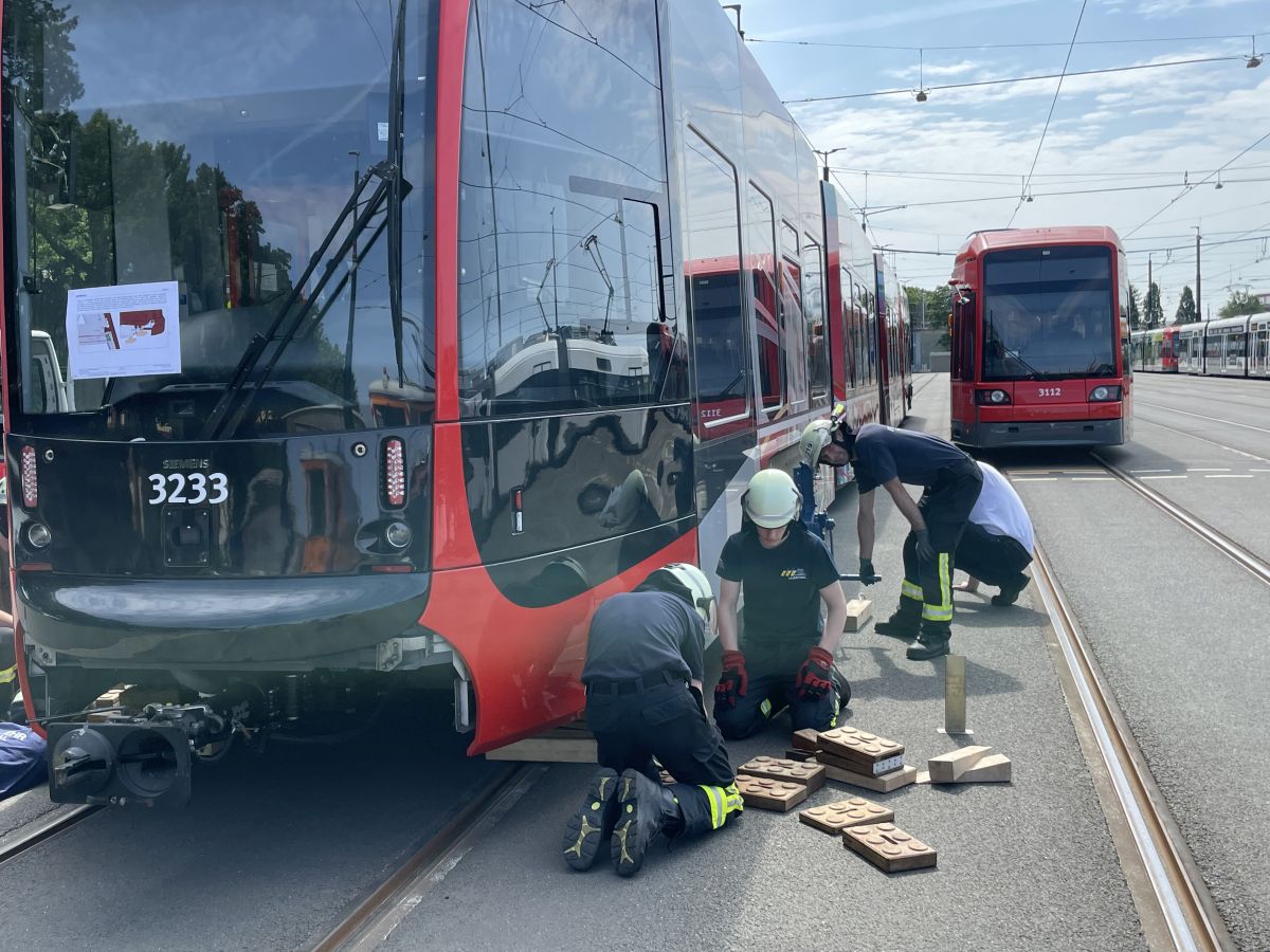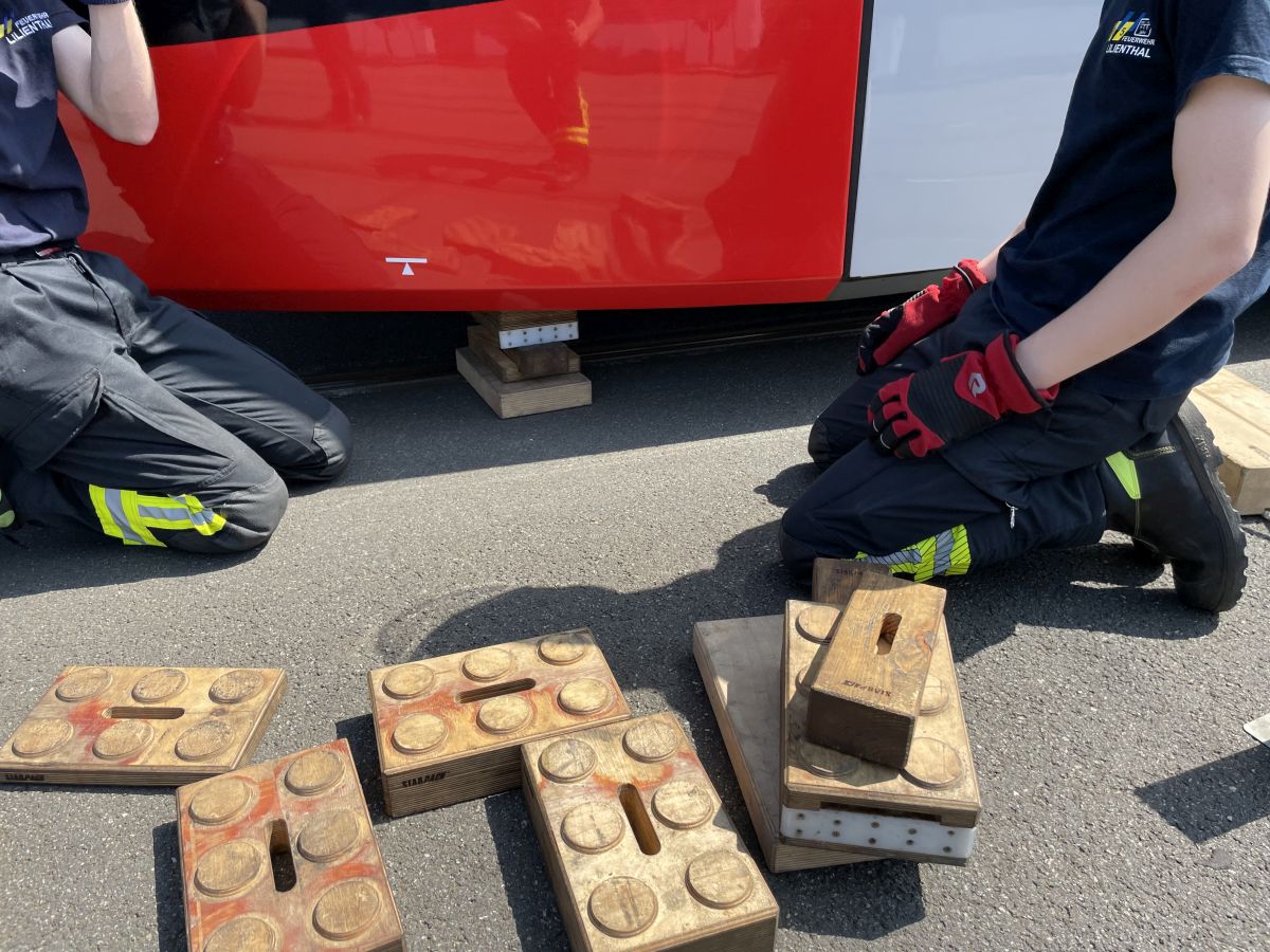 Nachdem die Bahn also gesichert war, wurde als nächstes das Material zum Anheben des Vorderwagens bereitgelegt und erklärt. Da eine Straßenbahn sehr schwer ist, wiegt auch das Material entsprechend und es ist viel Teamarbeit gefragt.
