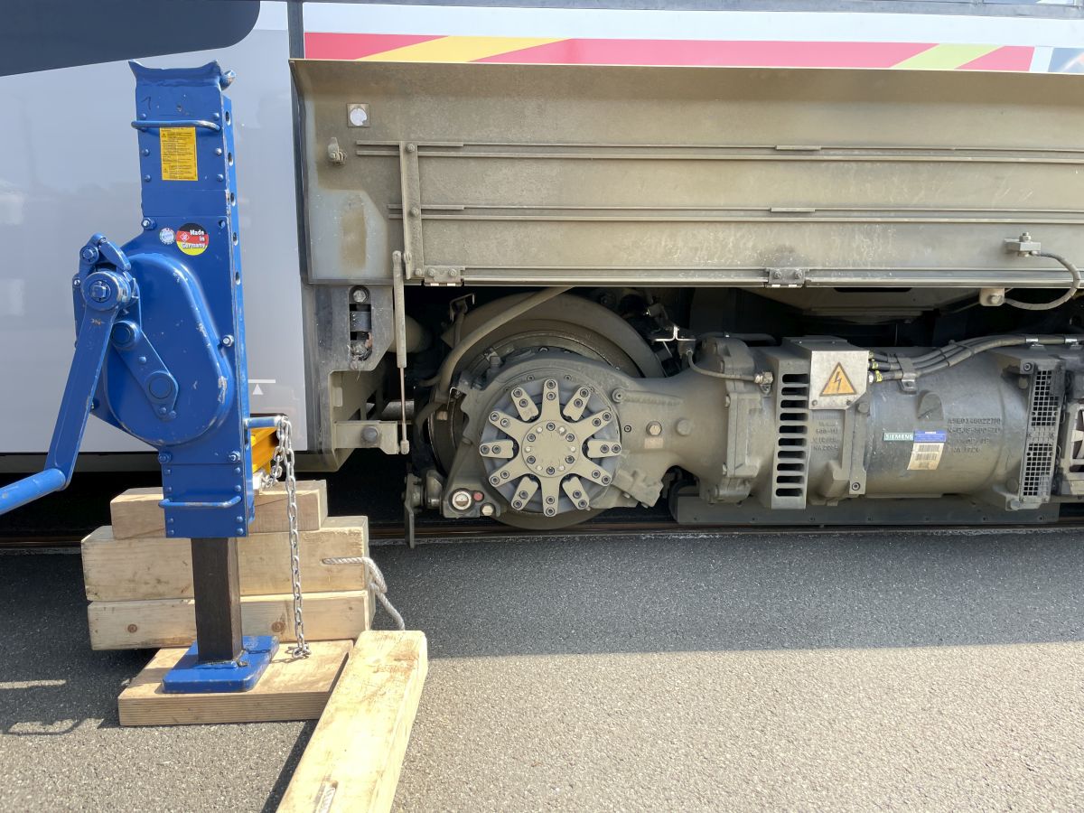 Als die Bahn hoch genug gehoben war und die Vorderräder den Schienenstrang verlassen hatten, wurde alles noch einmal begutachtet. Anschließend wurden vorsichtig alle Schritte rückwärts vollzogen, um die Bahn wieder ins Gleisbett einzusetzen.