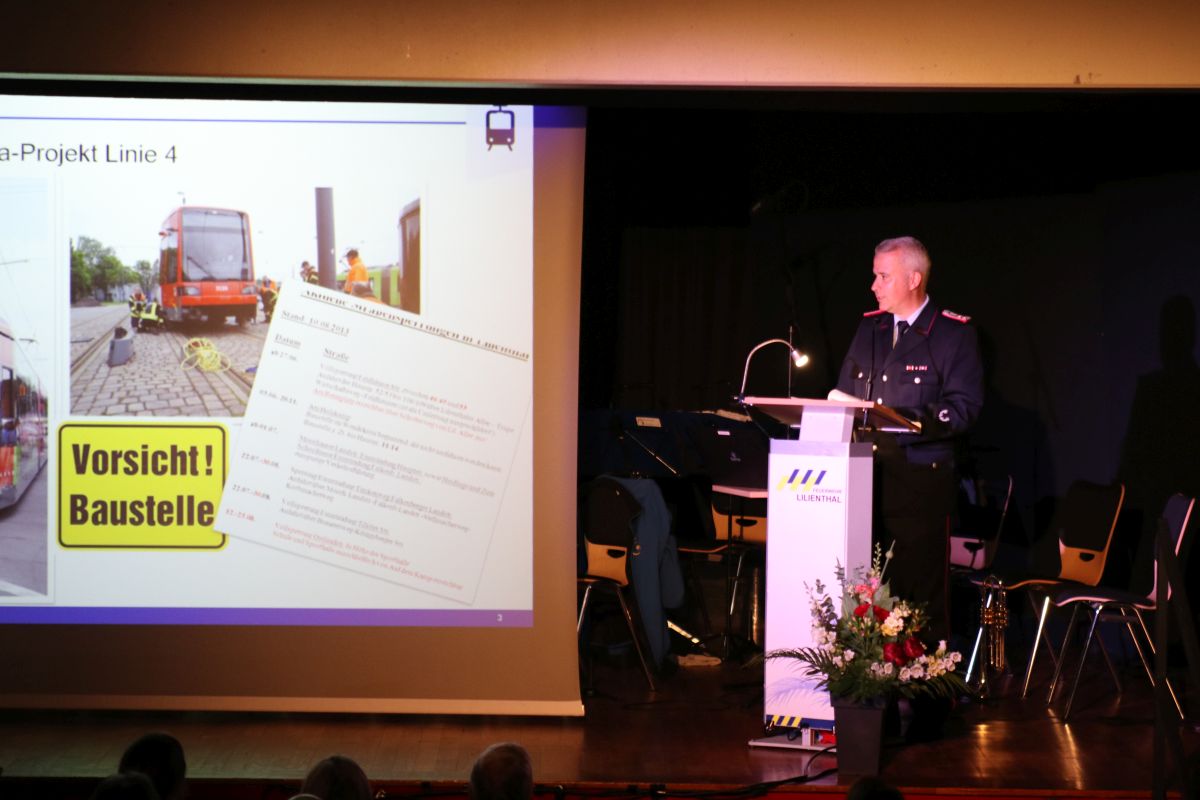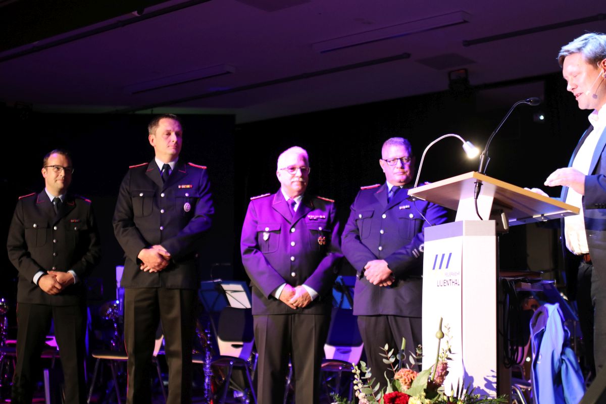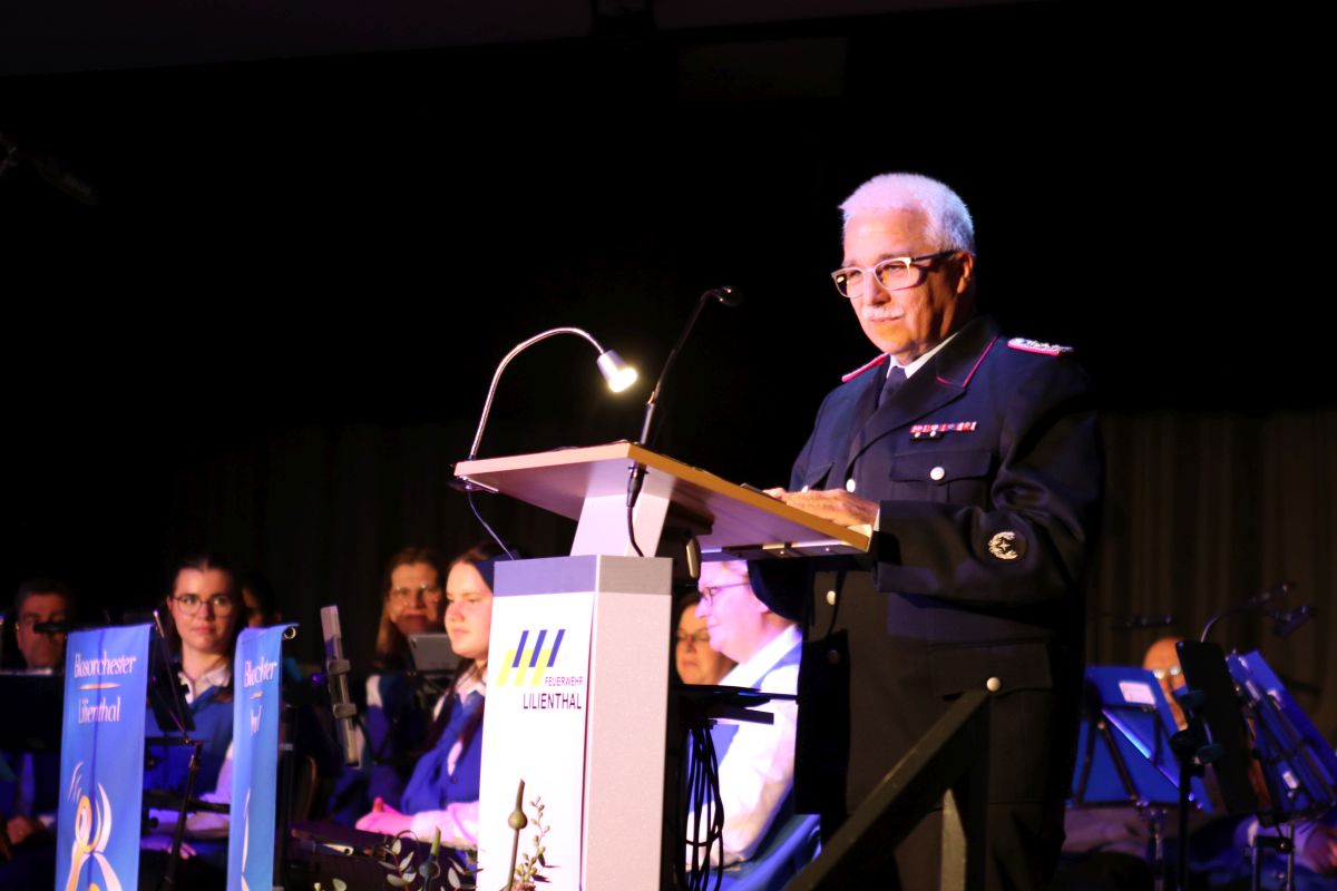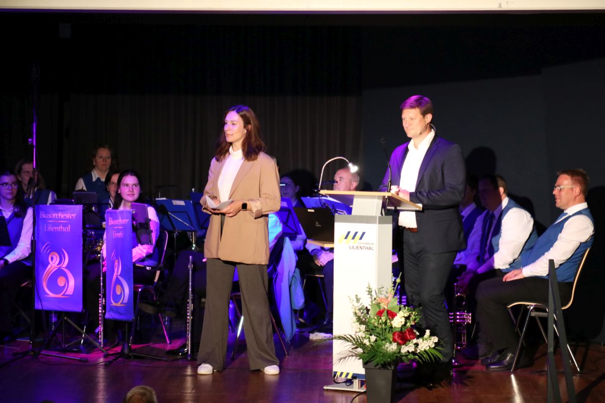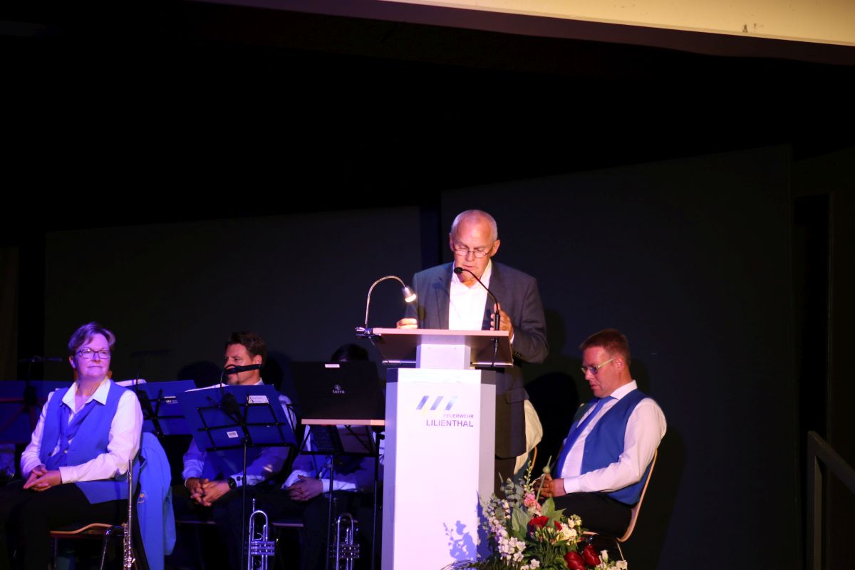 Zu Beginn der Feierstunde begrüßten Moderatorin Marilena Koch und Bürgermeister Kim Fürwentsches die anwesenden Gäste und sorgten für eine Einführung in den Abend. Nach einer großartigen musikalischen Eröffnung durch das Blasorchester Lilienthal unter der fachkundigen Leitung von Jürgen Desczka folgte im ersten Teil der Feierstunde mit dem Schwerpunkt der Kommandoübergabe eine Präsentation durch Nico Schröder (stellv. OrtsBM Worphausen) und Lars van den Hoogen (OrtsBM Lilienthal/Falkenberg), die die wichtigsten Stationen der Amtszeit von 2012 bis 2024 der scheidenden Gemeindebrandmeister hervorhoben. Dabei wurde an die mit dem Bau der Linie 4 für die Feuerwehr verbundenen Herausforderungen genauso erinnert, wie an den Prozess zur Erstellung des ersten Feuerwehrbedarfsplans in der Gemeinde. Die durch Andreas und Kai in dieser Zeit konsequent vorangetriebene Modernisierung des Fuhrparks, die Erweiterung der Feuerwehhäuser in Sankt Jürgen und in Worphausen, die Einführung des Digitalfunks und des Verwaltungsprogramms FeuerON wurden genauso beleuchtet, wie die Zeit der Corona Pandemie. Auch wurde auf besondere Einsätze wie das Weihnachtshochwasser 2023/2024 oder Andreas Hensels Unterstützung im Kompetenzzentrum im Innenministerium in Hannover im Rahmen der Flüchtlingskrise 2015 zurückgeblickt. Am Ende des Vortrags folgte dann der Blick in die Zukunft und es wurden die beiden Nachfolger Harm Behrens und Malte Braun dem Publikum vorgestellt. Ein herzlicher Dank ging abschließend auch an die beiden Ehefrauen Brigitte Hensel und Beate Garbade, die unter Zurückstellung der eigenen Interessen das Ehrenamt ihrer Ehemänner langjährig begleitet haben.