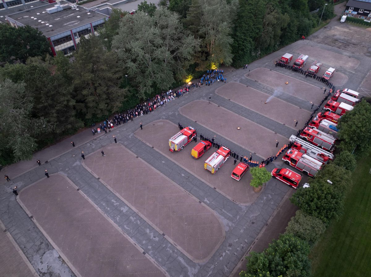 Nach einem Dank von Andreas und dem musikalischen Ausklang konnten sich die Gäste im Foyer noch ein wenig austauschen, bevor zum zweiten offiziellen Teil des Abends übergeleitet wurde. Hierzu bestiegen die beiden Ehepaare zunächst wieder die alte Drehleiter und machten noch eine kleine Bewegungsfahrt. Währenddessen gingen alle Gäste zum benachbarten Schoofmoor Parkplatz, wo sich Ihnen ein imposantes Bild bot. Hier war die komplette Gemeindefeuerwehr mit allen Abteilungen im Fackelschein zu einem Zapfenstreich angetreten.