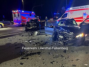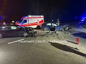 | Einsatzbericht: | Früh morgens wurde die Feuerwehr zu einem Verkehrsunfall auf der Lilienthaler Allee im Kreuzungsbereich Moorhauser Landstraße alarmiert. 2 PKWs waren kollidiert. Die Feuerwehr sicherte die Einsatzstelle ab und leitete sofort Maßnahmen zur Umweltgefahrenabwehr ein, indem ausgelaufene Betriebsstoffe (Öl und Kraftstoffe) mit Bindemittel abgestreut und aufgenommen wurden. Der Rettungsdienst war mit zwei RTWs vor Ort, um die Betreuung der Unfallbeteiligten zu gewährleisten. Nach der Freigabe durch die Polizei wurden die nicht mehr fahrbereiten Fahrzeuge mithilfe spezieller Rangierhilfen aus dem Kreuzungsbereich entfernt. Nach dem die verunfallten PKWs abgeschleppt wurden, konnte der Kreuzungsbereich für den Verkehr wieder freigegeben worden. |
