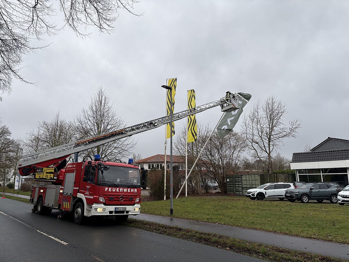 | Einsatzbericht: | Wegen des starken Windes drohte ein aus seiner Verankerung gerissener Fahnenmast auf abgestellte Fahrzeuge zu stürzen. |