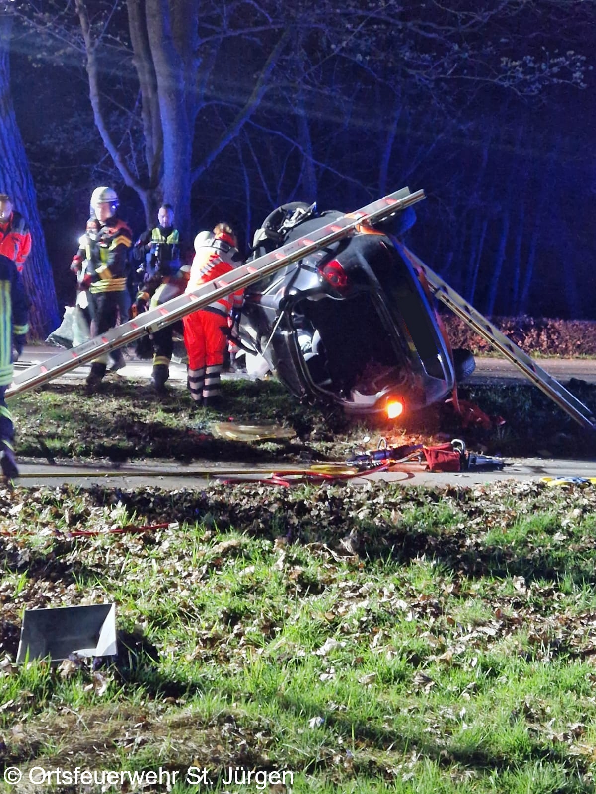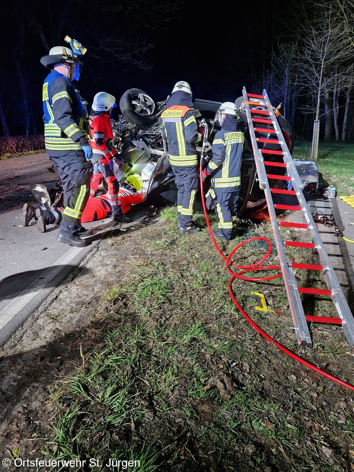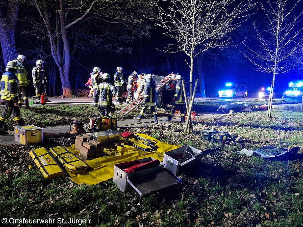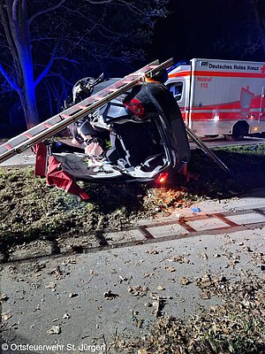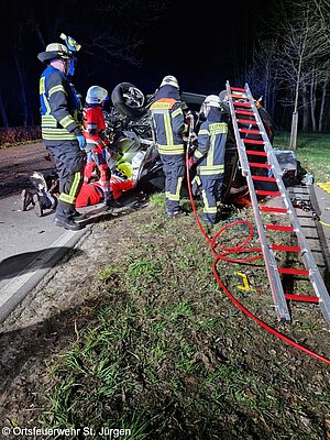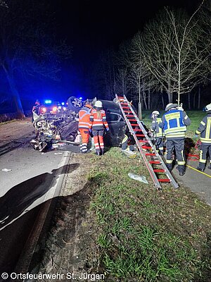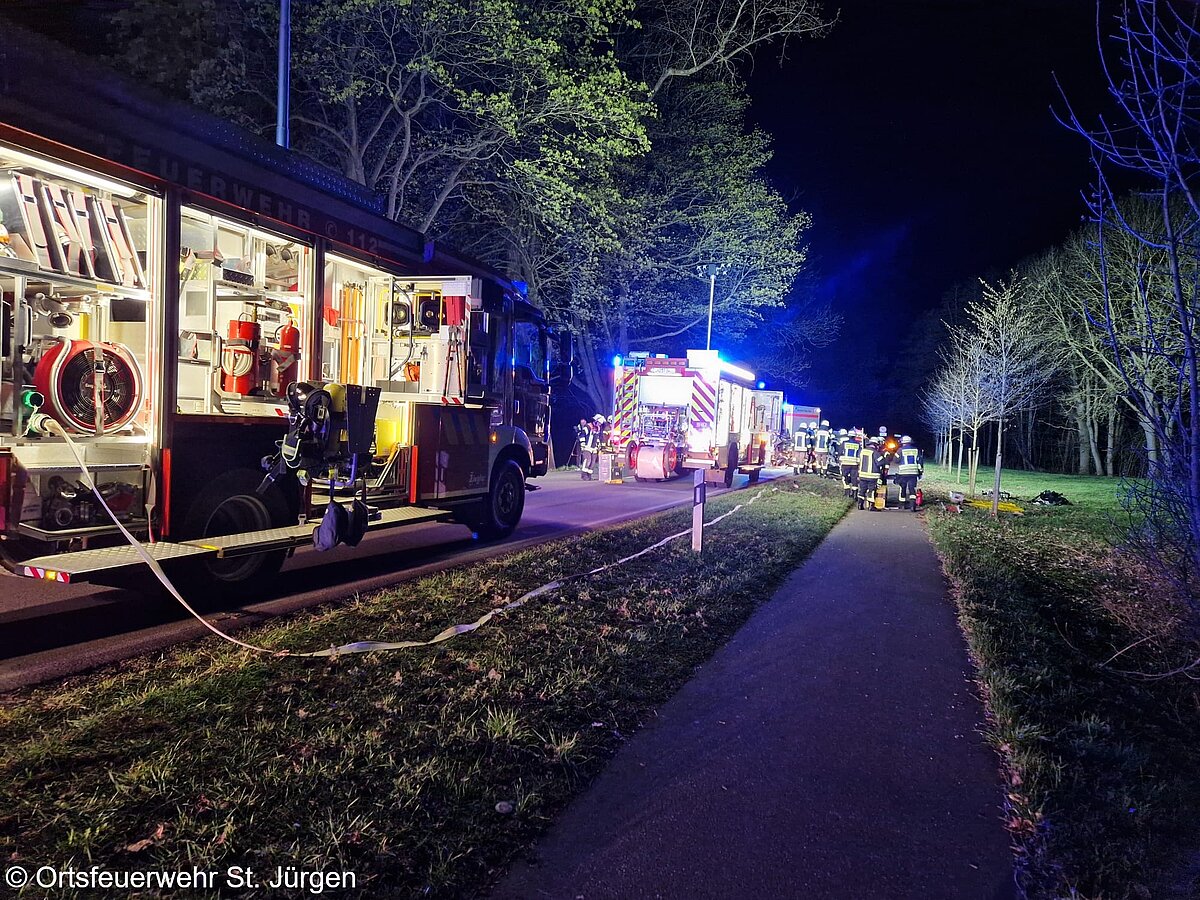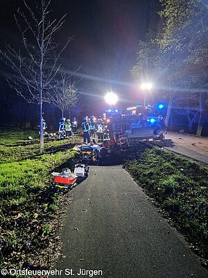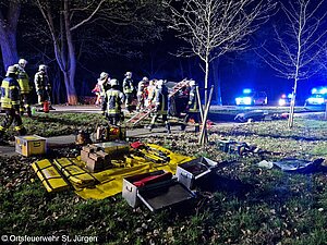 | Einsatzbericht: | Auf der K8 in Mittelbauer kam es zu einem schweren Verkehrsunfall mit eingeklemmter Person, der durch die Besatzung eines zufällig vorbeikommenden Notaztwagens entdeckt wurde. Das Fahrzeug war aus noch ungeklärter Ursache nach rechts von der Straße abgekommen und gegen einen Baum geprallt, überschlug sich danach mehrfach und kam seitlich auf der gegenüberliegenden Fahrbahn zu liegen. Das Fahrzeug wurde zunächst abgestützt und es wurden weitere Vorbereitungen für die anstehende Personenrettung getroffen. Der Fahrer wurde in enger Abstimmung mit der bereits anwesenden Notärztin durch die Ortfeuerwehr Lilienthal/Falkenberg unter Einsatz der hydraulischen Rettungsgeräte aus dem Fahrzeug befreit, dazu wurde schlussendlich das Dach des PKW abgetrennt. Die schwere der Verletzungen war nicht abzusehen, so dass der Rettungshubschrauber Christoph 26 schon zu beginn der Rettungsmaßnahmen zusatzlich angefordert wurde. Während der Patient im Rettungswagen versorgt wurde traf auch der Rettungshubschrauber ein. Der Transport erfolgte schließlich nicht mit dem Hubschrauer, sondern mit dem Rettungswagen in ein bremer Krankhaus. Die Ortsfeuerwehr LIlienthal/Falkenberg wurde nach gut einer Stunde bereits wieder aus dem Einsatz entlassen. Die Ortfeuerwehr St. Jürgen begann mit ersten Reinigungsarbeiten, allerdings dienten diese zunächst nur dazu, dass Einsatzfahrzeuge den Bereich ohne Beschädingungen in beide Richtungen passieren konnten. Zudem wurde Bindemittel zum Aufnehmen auslaubender Betriebsstoffe verteilt. Danach mussten die Arbeiten zunächst ruhen, da eine detaillierte Unfallafnahme durch die angeforderte "Tatortgruppe" der Polizei erfolgen sollte, die allerdings erst kurz nach 23 Uhr an der Einstzstelle eintraf. Die Unfallaufnahme wurde durch Ausleuchten der Einsatzstelle unterstützt und dauerte ca. eineinhalb Stunden. Nach deren Abschluss konnte auch die Ortfeuerwehr St. Jürgen die verbliebenen Einsatzmittel abbauen und verstauen, so dass die Einsatzstelle um ca. 1 Uhr an die Polizei übergeben wurde. Während des Einsatzes und bis zum Abtransport des Unfallfahrzeugs durch ein Abschleppunternehmen war die Kreisstraße zwischen Frankenburg und Abzweig nach Osterholz voll gesperrt. Die Freigabe erfolgte um ca. 2.40 Uhr. Eine Videobericht zum Einsatz ist hier zu sehen. |