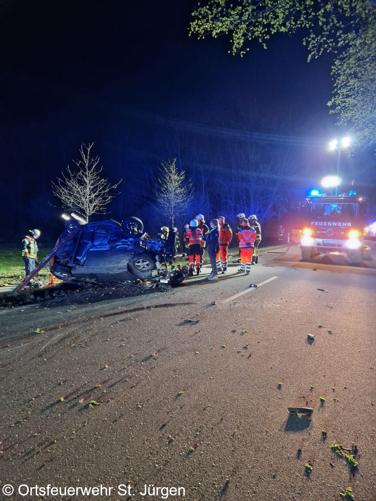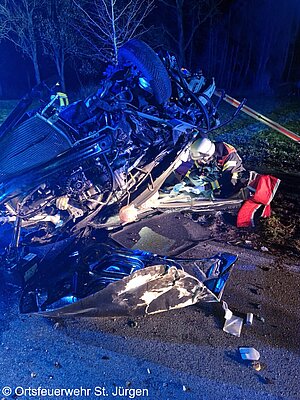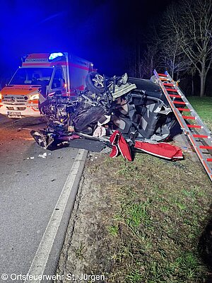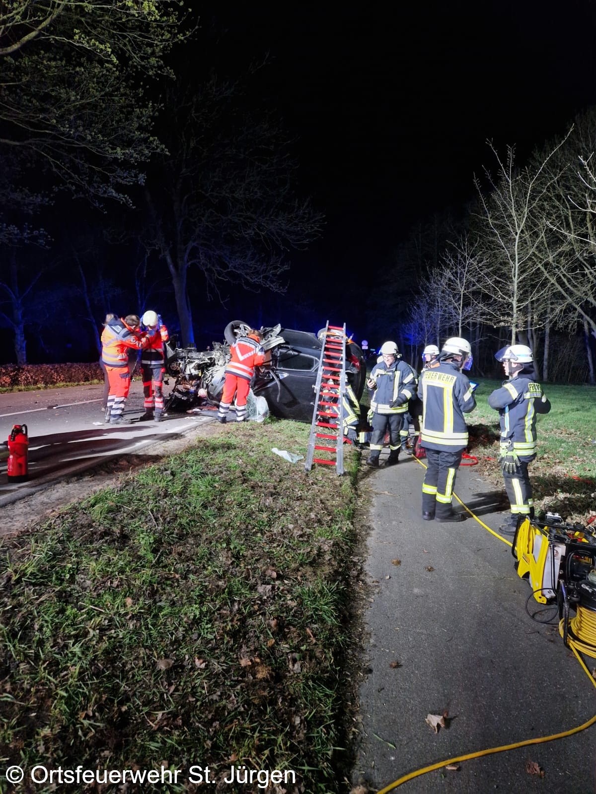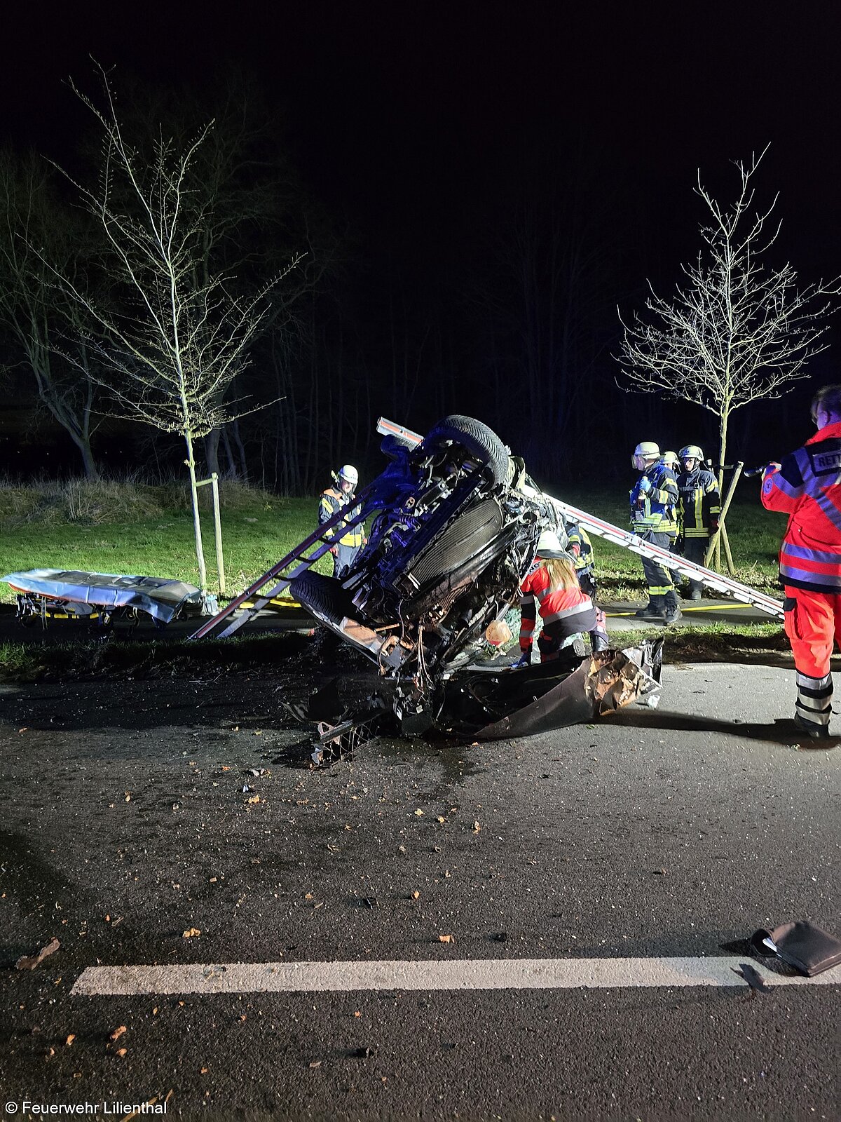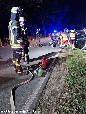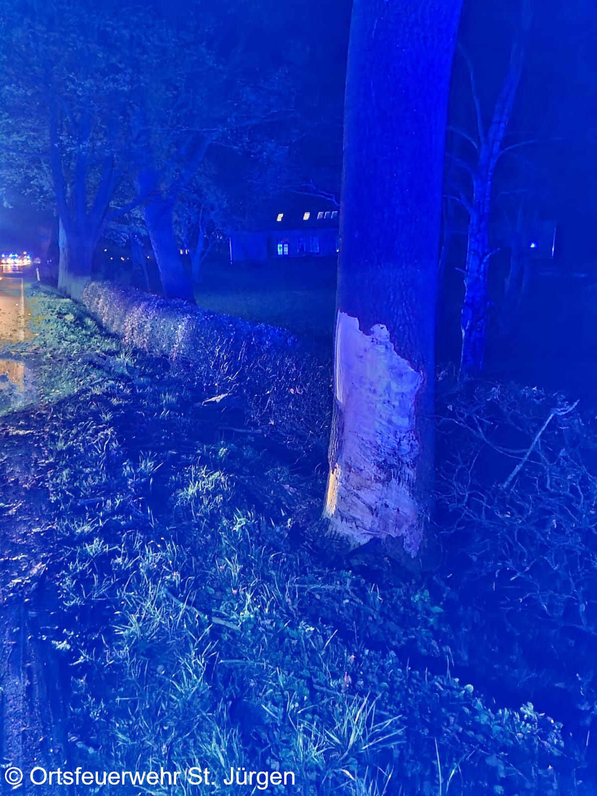 | Einsatzbericht: | Auf der K8 in Mittelbauer kam es zu einem schweren Verkehrsunfall mit eingeklemmter Person, der durch die Besatzung eines zufällig vorbeikommenden Notaztwagens entdeckt wurde. Das Fahrzeug war aus noch ungeklärter Ursache nach rechts von der Straße abgekommen und gegen einen Baum geprallt, überschlug sich danach mehrfach und kam seitlich auf der gegenüberliegenden Fahrbahn zu liegen. Das Fahrzeug wurde zunächst abgestützt und es wurden weitere Vorbereitungen für die anstehende Personenrettung getroffen. Der Fahrer wurde in enger Abstimmung mit der bereits anwesenden Notärztin durch die Ortfeuerwehr Lilienthal/Falkenberg unter Einsatz der hydraulischen Rettungsgeräte aus dem Fahrzeug befreit, dazu wurde schlussendlich das Dach des PKW abgetrennt. Die schwere der Verletzungen war nicht abzusehen, so dass der Rettungshubschrauber Christoph 26 schon zu beginn der Rettungsmaßnahmen zusatzlich angefordert wurde. Während der Patient im Rettungswagen versorgt wurde traf auch der Rettungshubschrauber ein. Der Transport erfolgte schließlich nicht mit dem Hubschrauer, sondern mit dem Rettungswagen in ein bremer Krankhaus. Die Ortsfeuerwehr LIlienthal/Falkenberg wurde nach gut einer Stunde bereits wieder aus dem Einsatz entlassen. Die Ortfeuerwehr St. Jürgen begann mit ersten Reinigungsarbeiten, allerdings dienten diese zunächst nur dazu, dass Einsatzfahrzeuge den Bereich ohne Beschädingungen in beide Richtungen passieren konnten. Zudem wurde Bindemittel zum Aufnehmen auslaubender Betriebsstoffe verteilt. Danach mussten die Arbeiten zunächst ruhen, da eine detaillierte Unfallafnahme durch die angeforderte "Tatortgruppe" der Polizei erfolgen sollte, die allerdings erst kurz nach 23 Uhr an der Einstzstelle eintraf. Die Unfallaufnahme wurde durch Ausleuchten der Einsatzstelle unterstützt und dauerte ca. eineinhalb Stunden. Nach deren Abschluss konnte auch die Ortfeuerwehr St. Jürgen die verbliebenen Einsatzmittel abbauen und verstauen, so dass die Einsatzstelle um ca. 1 Uhr an die Polizei übergeben wurde. Während des Einsatzes und bis zum Abtransport des Unfallfahrzeugs durch ein Abschleppunternehmen war die Kreisstraße zwischen Frankenburg und Abzweig nach Osterholz voll gesperrt. Die Freigabe erfolgte um ca. 2.40 Uhr. Eine Videobericht zum Einsatz ist hier zu sehen. |